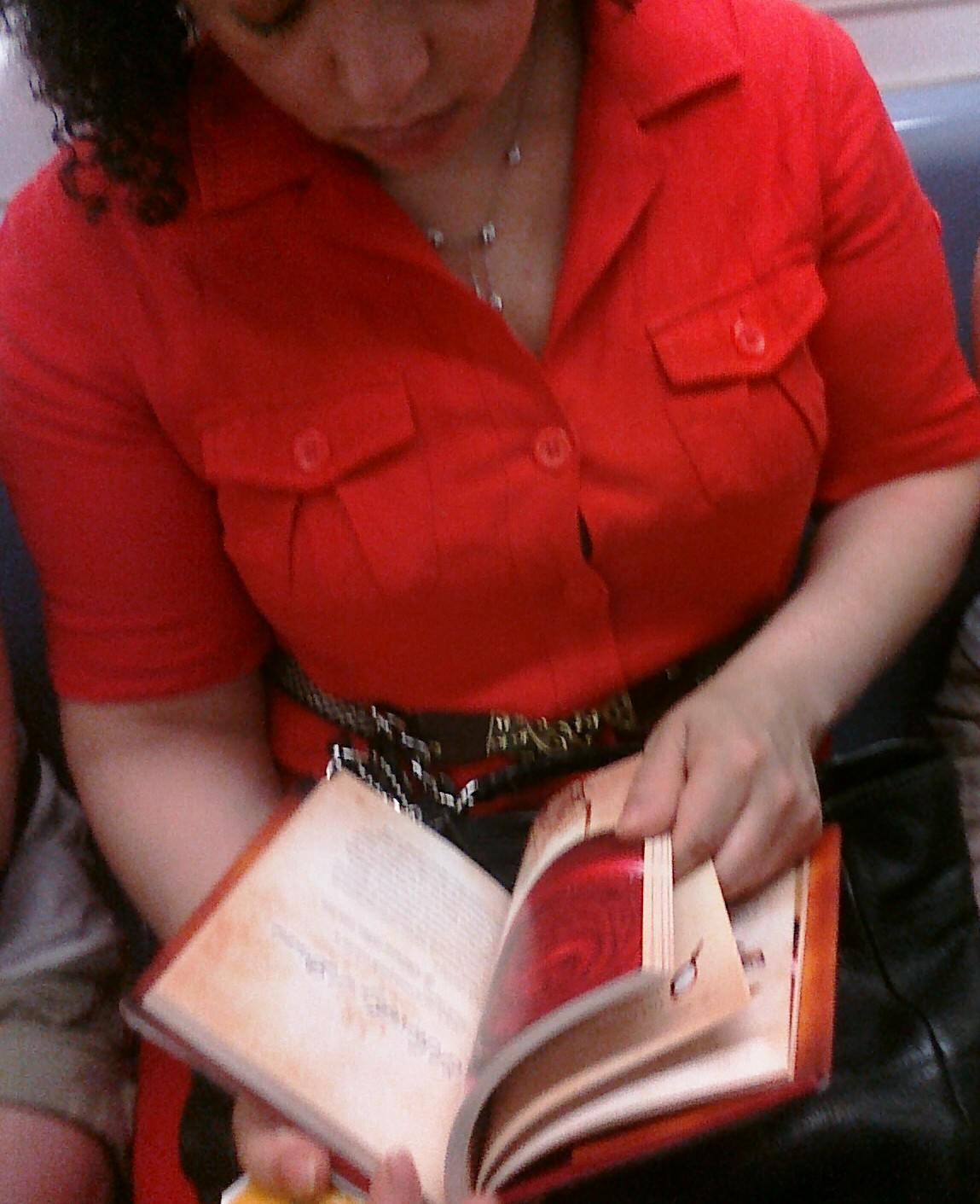 I love this orange shirt dress, and I bet it looked fine when she was standing in front of a mirror. After all, she’s probably only a B cup (hence her ability to wear pockets at the chest–although I don’t think it’s impossible for D cups and higher to wear them). This picture just goes to show that we’re not alone in our battle against the gap. Almost all women with breasts must be aware of what can happen between the buttons. (Nothing after the jump.)