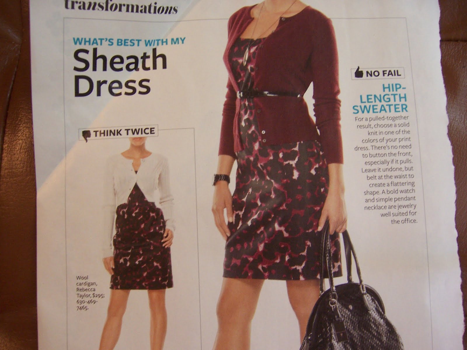 For a pulled-together result, choose a solid knit in one of the colors of your print dress. There’s no need to button the front, especially if it pulls. Leave it undone, but belt at the waist to create a flattering shape.
