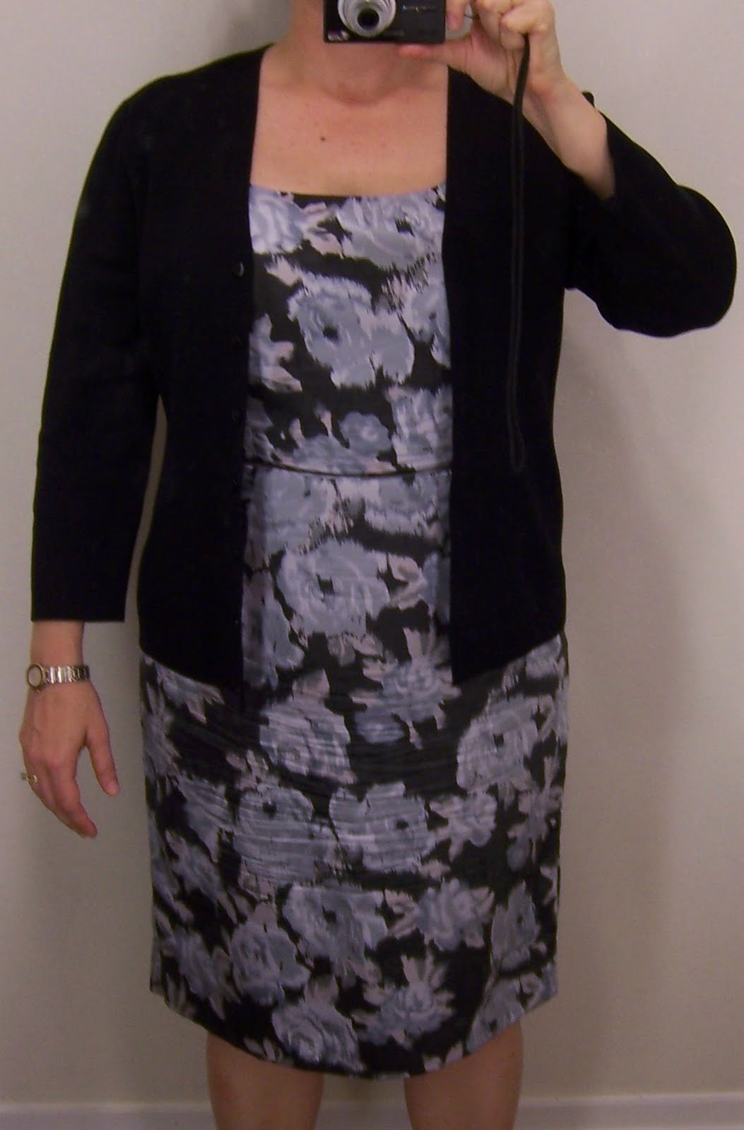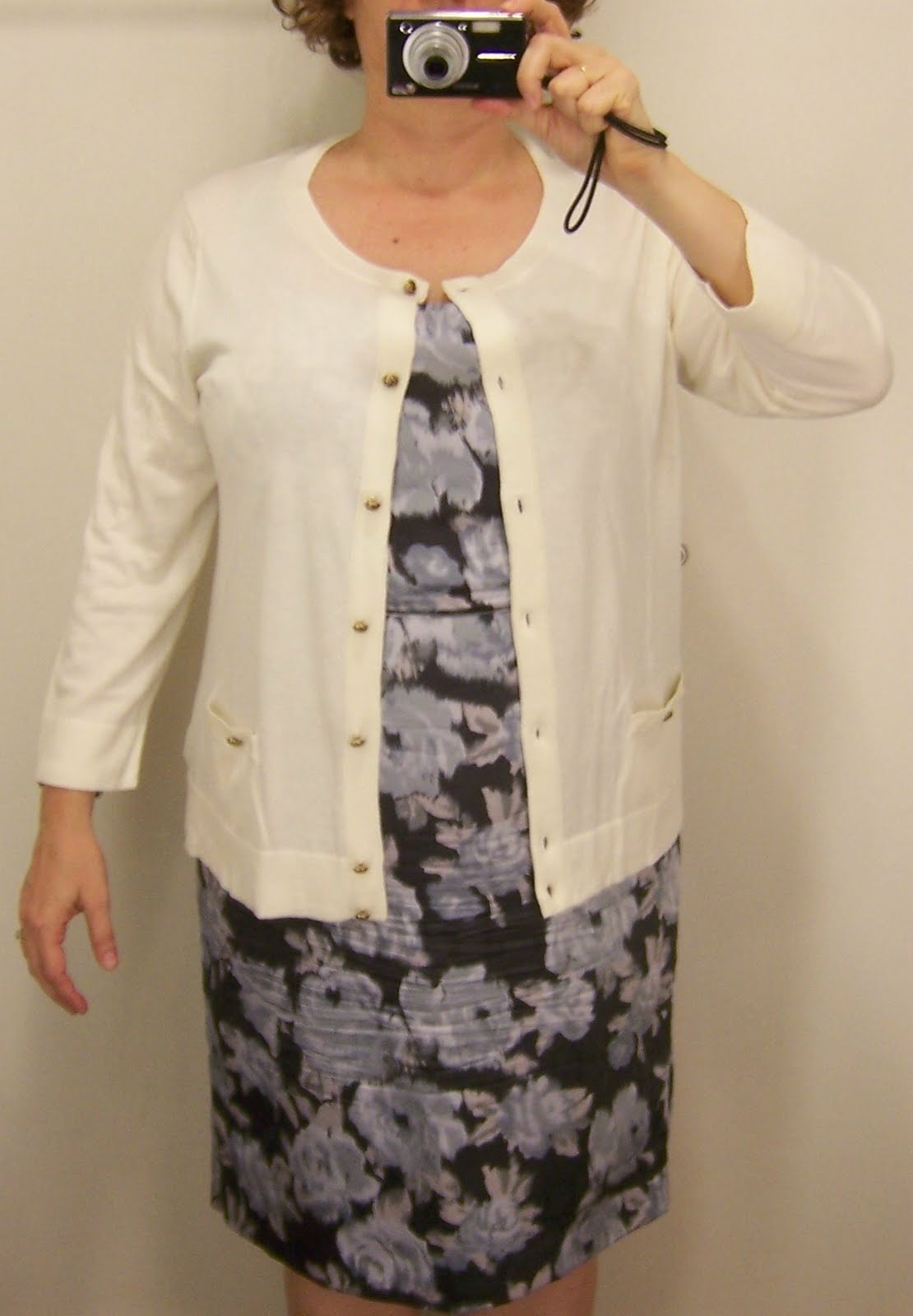 Next, a cream cardigan from Talbots. The crew-neck required a different approach from the V-neck above. Pictures 1 and 2 are a No, but Picture 3 is a Yes. Fastening the bottom buttons creates a flattering V. The cream also brightens things up, although I’d like to see this sweater in a dove grey.