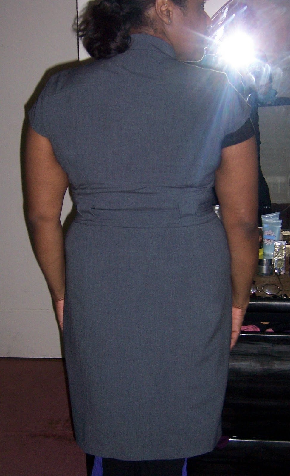 They don’t show up very well in the photos, but flattering princess seams run the length of the dress. You can see them better in the khaki version that I found here on Zappos for $97.50. Fran’s dress just looks more work-appropriate in grey and polyester/rayon/spandex. The khaki dress is 97% cotton, 3% spandex.