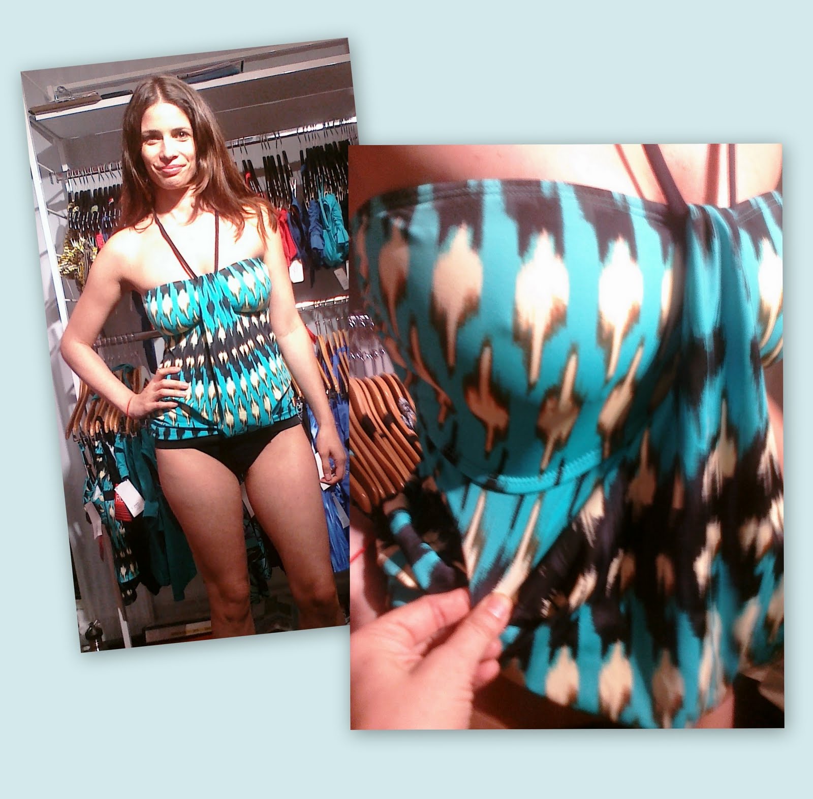 | I included this photo because I am ecstatic about a bandeau that offers full coverage of the breasts without any boob bifurcation. The photo on the right shows how much room there is for larger breasts. This model wears a 32C bra but is wearing a 34C tankini top. |